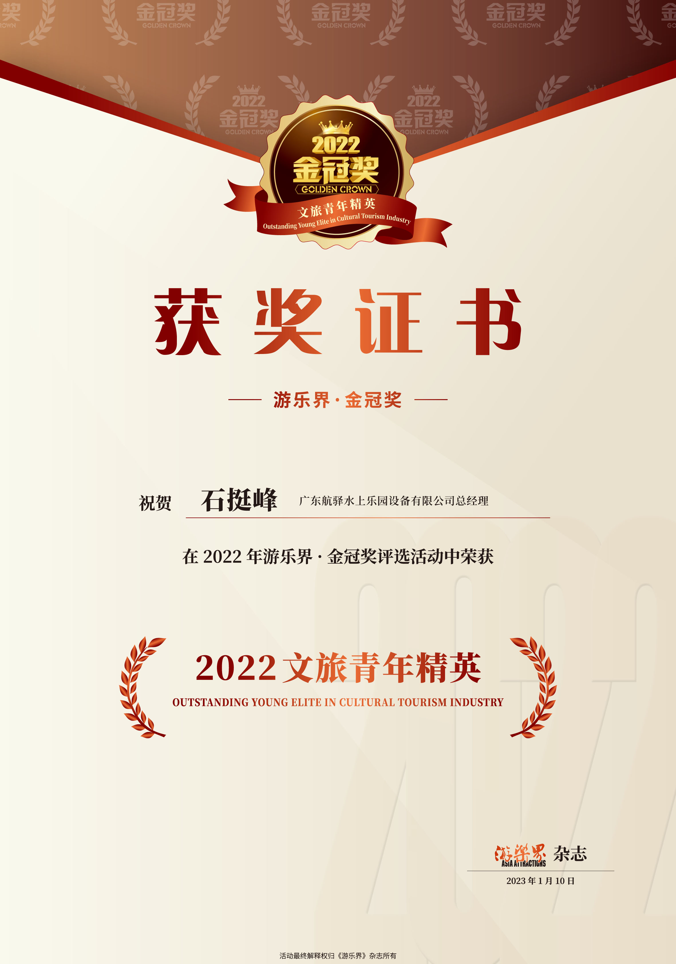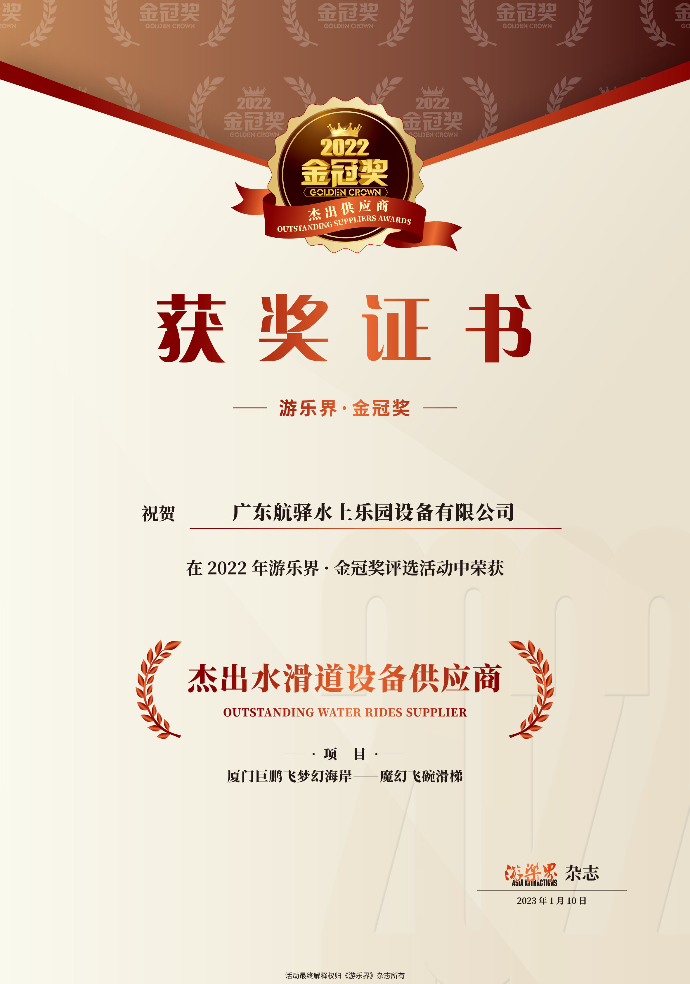 广东航驿水上乐园设备有限公司,在2022年游乐界·金冠奖评选活动中,再创佳绩,荣获两项殊荣:总经理石挺峰荣获“2022文旅青年精英”殊荣;航驿通过自主研发、制造、安装并落地于厦门巨鹏飞梦幻海岸项目的魔幻飞碗滑梯荣获“杰出水滑道设备供应商奖”殊荣。